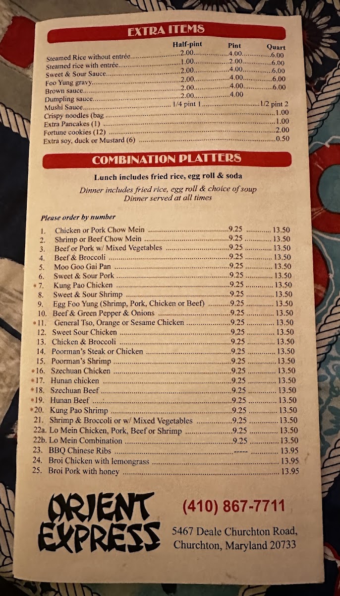 Step right up to the culinary adventure that is the Orient Express Menu! Nestled on Deale Churchton Rd in Churchton, this spot effortlessly blends classic flavors with bold, inventive twists. As you flip through the offerings, you’ll notice a mix that satisfies both the comfort food cravings and the adventurous palate seekers. From sizzling appetizers that tease your taste buds to main courses bursting with rich aromas and textures, every dish seems thoughtfully crafted to make each bite memorable. The menu doesn’t just stick to one style-it moves smoothly between familiar favorites and exotic inspirations, keeping things exciting yet approachable. What’s really fun is how easy it is to mix and match; whether you’re in the mood for something light or ready to indulge in a hearty plate, the selections feel inviting without being overwhelming. And don’t forget the sides and small plates-they’re perfect for sharing or sampling a bit of everything as you explore the flavors that make this place stand out.